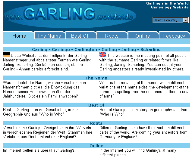 Diese Homepage ist eigentlich nicht auf eine Familie beschränkt. Sie wendet sich an alle Namensträger. Deshalb wurde nicht nur die Adresse www.garling.deverwendet, sondern auch www.garling.net und www.garling.eu. Dementsprechend ist die Website (größtenteils) zweisprachig gestaltet. Zusätzlich werden nicht nur Namensträger genau eines Namens angesprochen, sondern auch die regional abweichender Varianten (plattdeutsch: Garling, hochdeutsch: Gerling, friesisch: Jarling, dänisch: Scharling, ...). Auf der Einstiegsseite "Home" wird Anliegen und Inhalt der Website dargelegt. Die Rubrik "The Name" analysiert den Namen und seine Varianten, außerdem werden