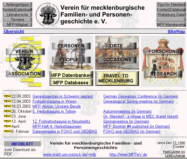 Die Website des "Vereins für mecklenburgische Familien- und Personengeschichte" ist (größtenteils) zweisprachig aufgebaut. Neben den vier Hauptrubriken: