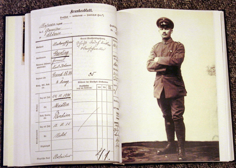 2. "80 Jahre in der Geschichte": Dieses Kapitel steht unter der Überschrift: Politik, Sport, Kultur und Hermann ... - Ein Blick in die Geschichte Grundlage des Kapitels ist eine Liste von historischen Ereignissen vom Geburts- bis zum Todesjahr Hermanns. Pro Jahr werden vier bis acht Ereignisse gelistet sowie ein Foto eines bedeutenden Ereignisses des Jahres abgebildet. Diese Aufzählung wird mit einem Schreibmaschinenfont dargestellt. Dazwischen werden Ereignisse aus Hermanns Leben mit einem Schreibschriftfont eingefügt. Für das Jahr 1903 heißt es beispielsweise: 1. Januar 1903April 1903: Hermann besucht die 6. Klasse Als Foto des Jahres wurde ein Bild des ersten Motorfluges gewählt. Dieser Abschnitt umfaßt etwa 60 Seiten. 3. "Das Leben": Dieses Kapitel schildert das Leben Hermanns in fünf Abschnitten: Kindheit und Jugend, Armee, Grundbuchamt, Reichsbahn, Rentner. Hermanns Leben wird chronologisch geschildert. Familie, Schulfreunde, Verwandte, Kameraden, Arbeitsstellen und Kollegen, Wohnorte, u.s.w. werden erwähnt. Neben diesen mit normalem Font geschriebenen Ausführungen werden mit etwas kleinerem Font beispielsweise geschichtliche Ereignisse geschildert oder auftauchende Städte kurz beschrieben. Dadurch werden die persönlichen Ereignisse in Verbindung mit der jeweiligen historischen Situation anschaulich dargestellt. Fußnoten weisen auf Quellen hin und machen auch auf noch ungeklärte Sachverhalte aufmerksam. Bilder aus der jeweiligen Zeit, aus dem jeweiligen Ort machen die Gestaltung abwechslungsreicher. Zur lebendigen Gestaltung der Biographie trägt auch die Verwendung zeitgenössischer Schilderungen aus der Literatur bei. In Anekdoten vom Grenadierregiment beispielsweise, wurde der handelnde Grenadier als Hermann identifiziert. Zeitgenössische Schilderungen des bäuerlichen Lebens wurden auf Hermanns Elternhaus angepaßt. Also das genaue Gegenteil von "alle Namen sind frei erfunden, Ähnlichkeiten wären rein zufällig". Nach jedem Abschnitt werden zugehörige Dokumente und Bilder angefügt. Das sind beispielsweise: Auszug aus der Kirchchronik des Geburtsortes (die eingezogenen Beichtkinder werden aufgeführt), Krankenblatt aus dem Lazarett, Fotos der Grenadiere im Krieg, geschriebene Post- und Ansichtskarten, Hochzeitsbild, verschiedene Auszüge aus dem Schweriner Adreßbuch, Familienfotos, alte Ansichtskarten und heutige Fotos von den Arbeitsstellen (Grenadierkaserne, Grundbuchamt, Stellwerk in Schwerin) und Wohnhäusern, Kopien von Dokumenten die Arbeit betreffend, alte Familienfotos. 4. "Genealogie": Dieses Kapitel dient der Dokumentation aller genealogischer Daten. Die Abschnitte Hermann / Hermanns Geschister / Hermanns Vorfahren / Hermanns Ahnen / seine Frau / ihre Geschister / ihre Vorfahren / Hermanns Nachfahren / Ahnengeschichte / Hermanns Verwandte enthalten Kopien von Kirchbuchauszügen, Standesamtsurkunden und Volkszählungen. Der Abschnitt "Hermanns Ahnen" umfaßt noch ältere Dokumente: Kopien der Landbede, aus dem Amtsprotokollbuch des Klosters Dobbertin und alten Pfarrchroniken. Mit dem verwendeten Genealogieprogramm wurden zu allen Abschnitten Vorfahren-, Nachfahren- und Verwandschaftsgrafiken erzeugt, der Abschnitt "Hermanns Verwandte" wurde komplett generiert. Technische Details: Die Texte wurden überwiegend in Word 2000 erfaßt. Kopien aus Büchern u. ä. wurden mit einem normalen Kopierer